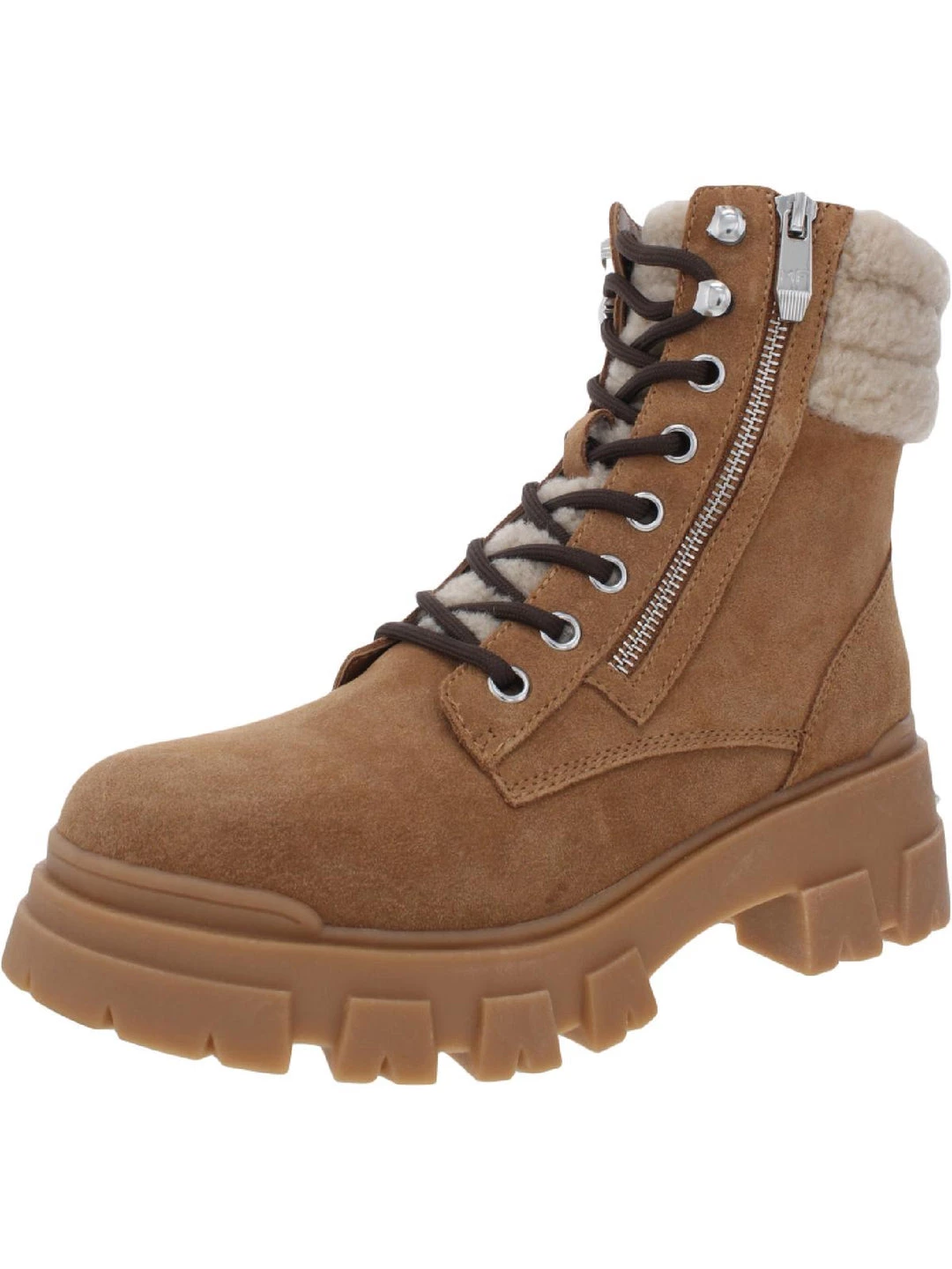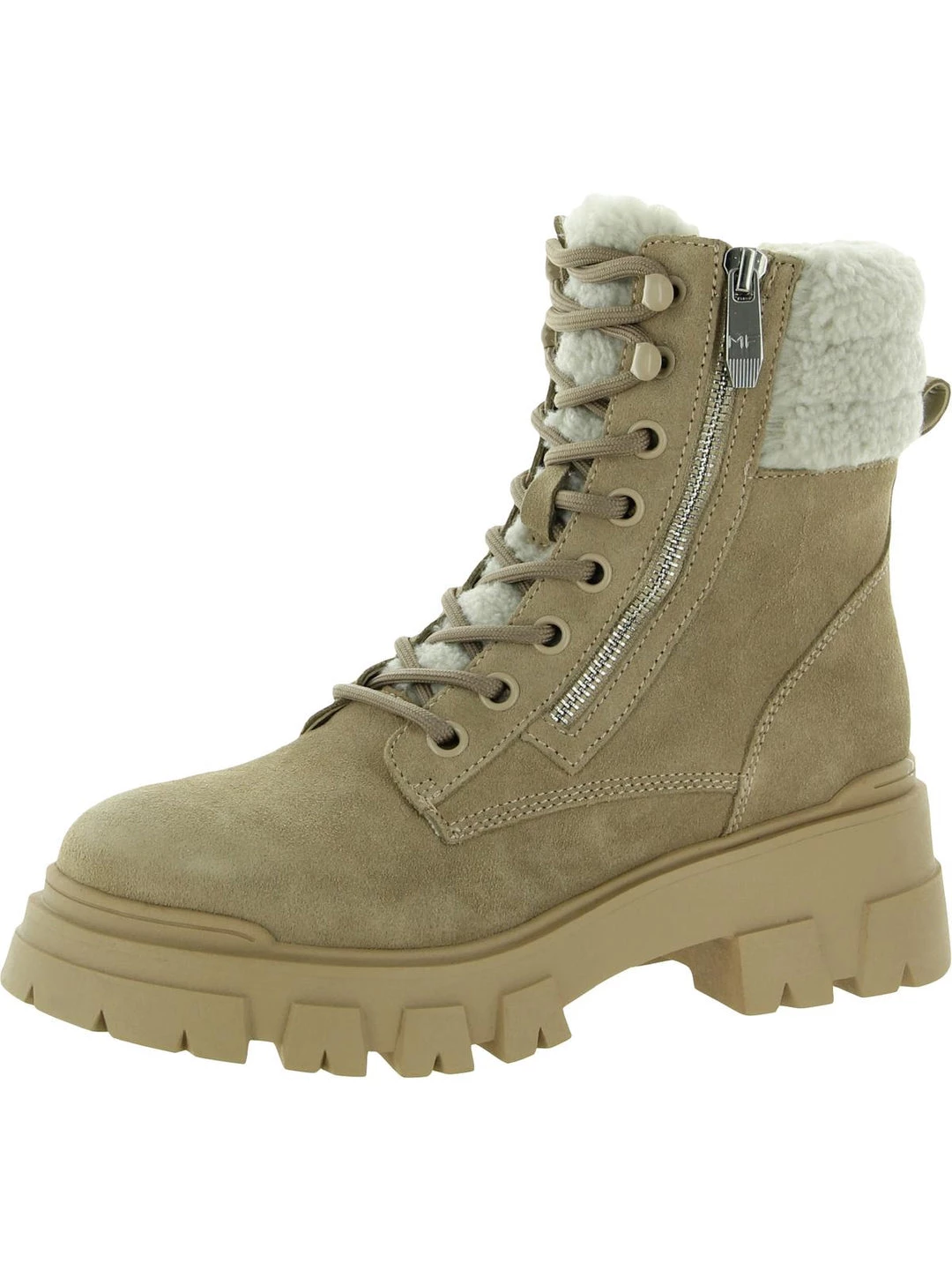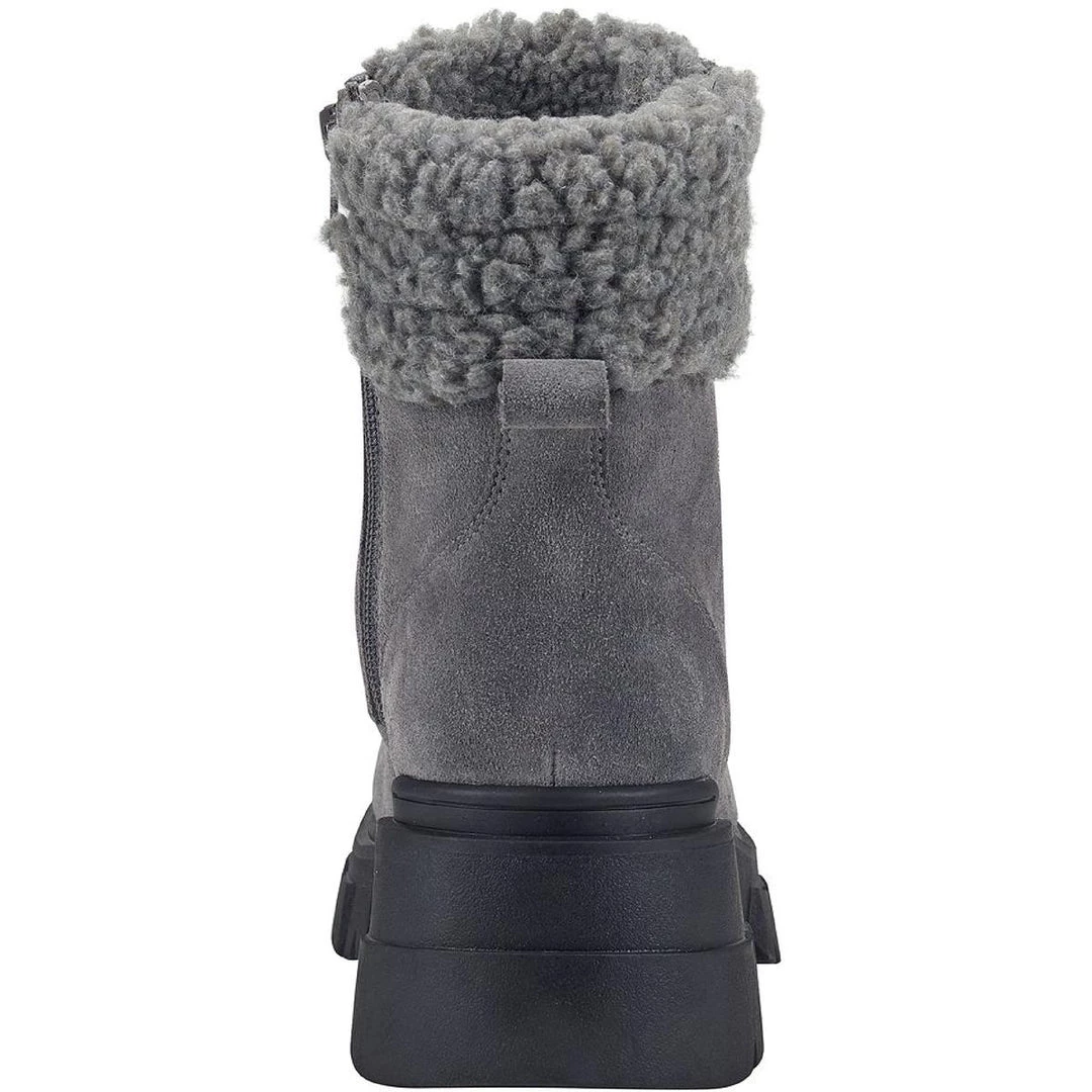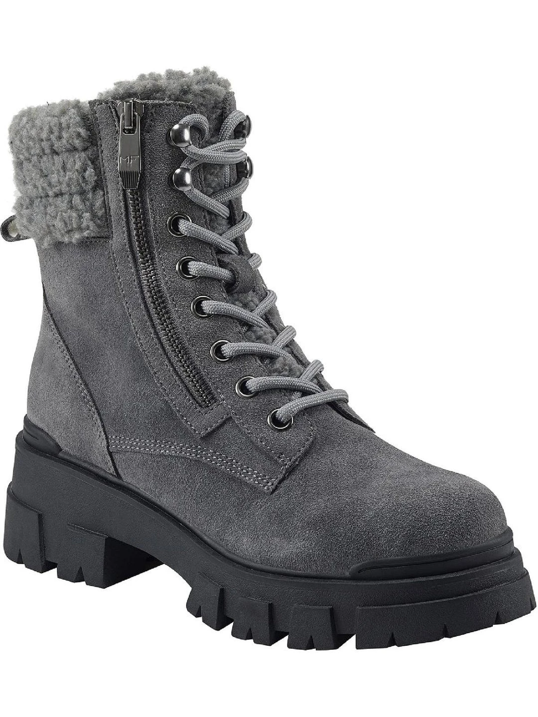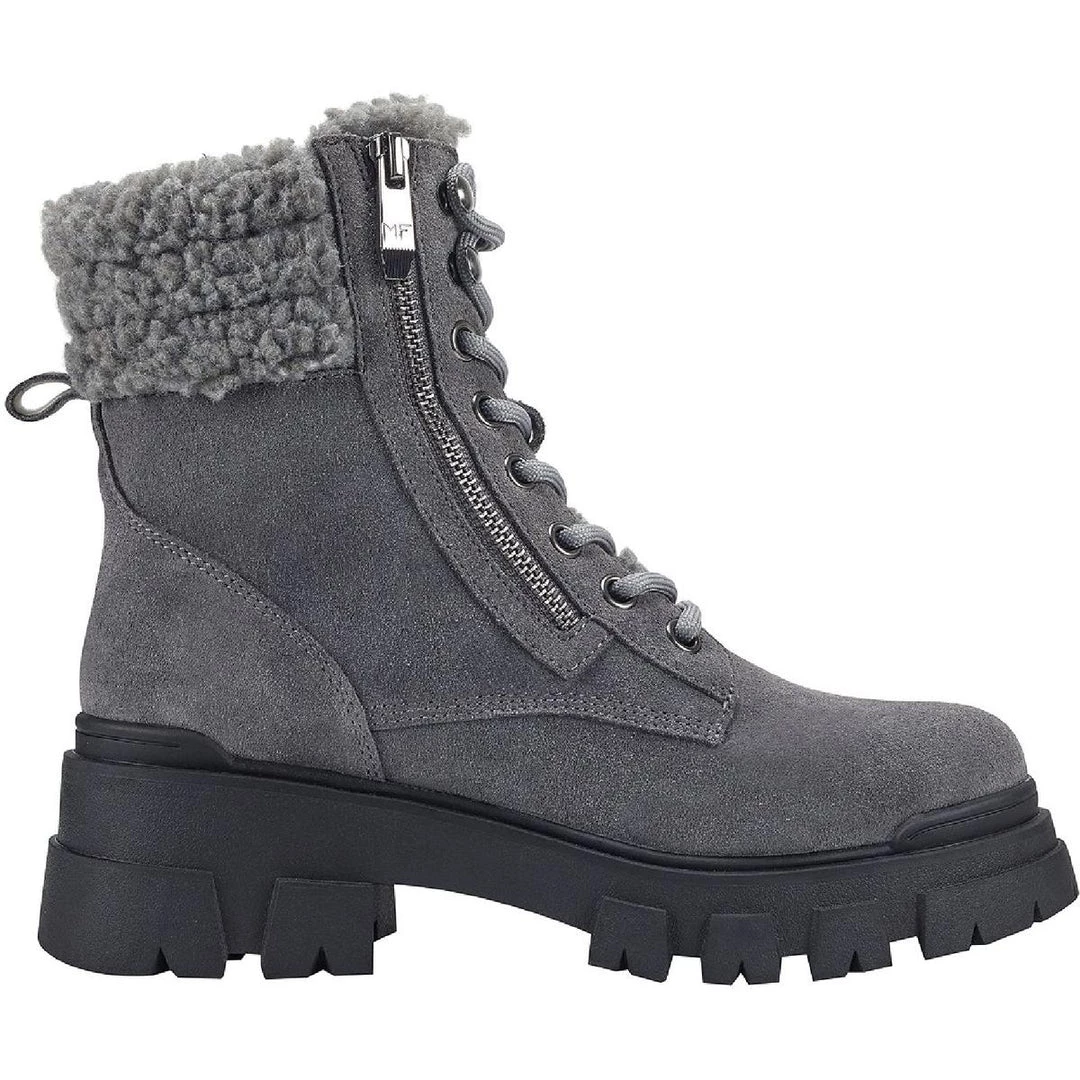Keep your look bold in the Aboli suede ankle boots by Marc Fisher. Suede uppers with a side zip construction. These boots offer a combat feel to a classic hiker with their lug soles and lace-up design. Made with a padded footbed and synthetic outsoles.