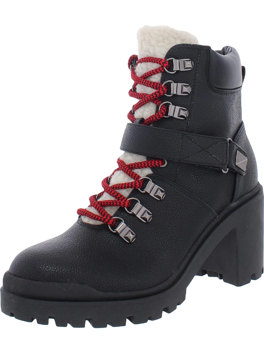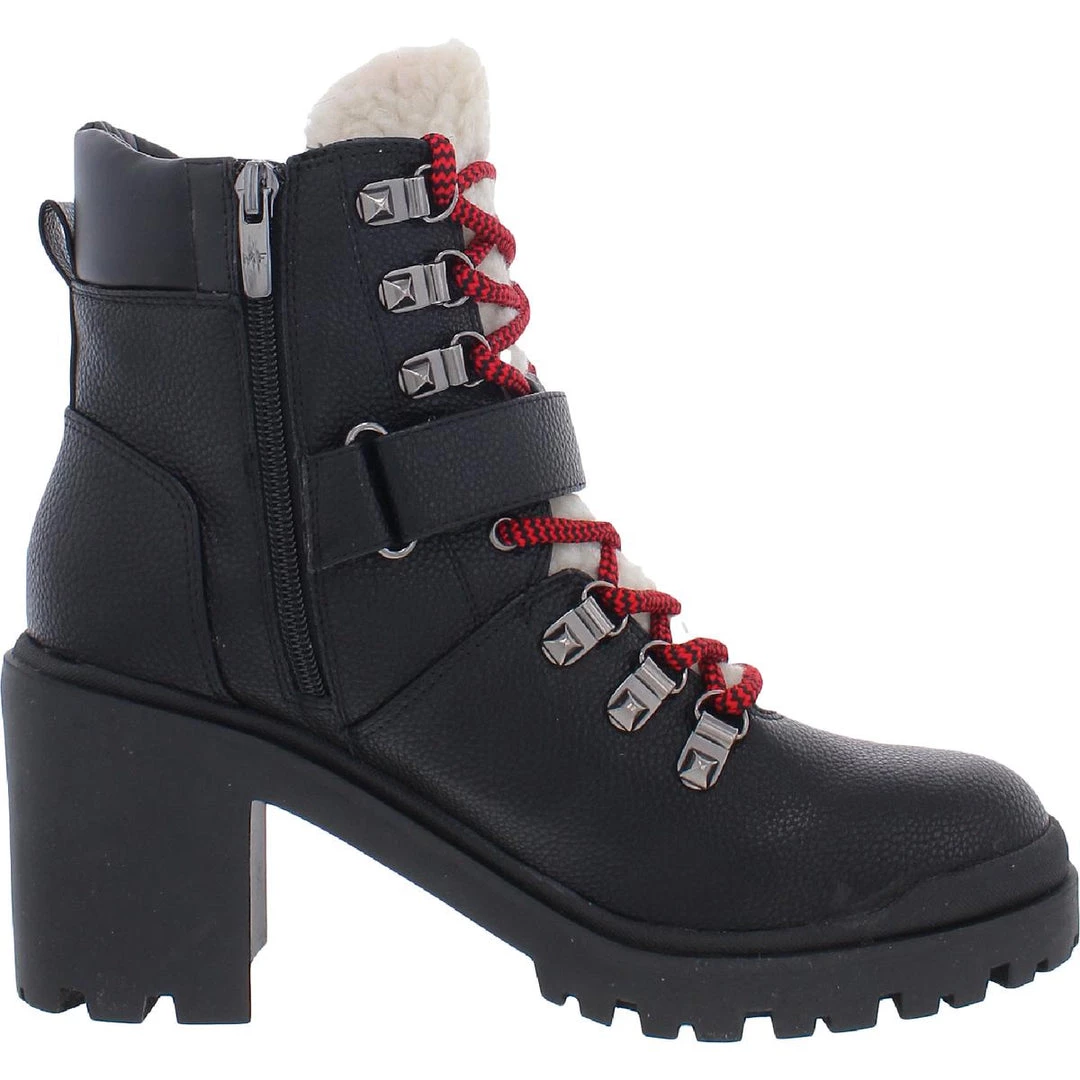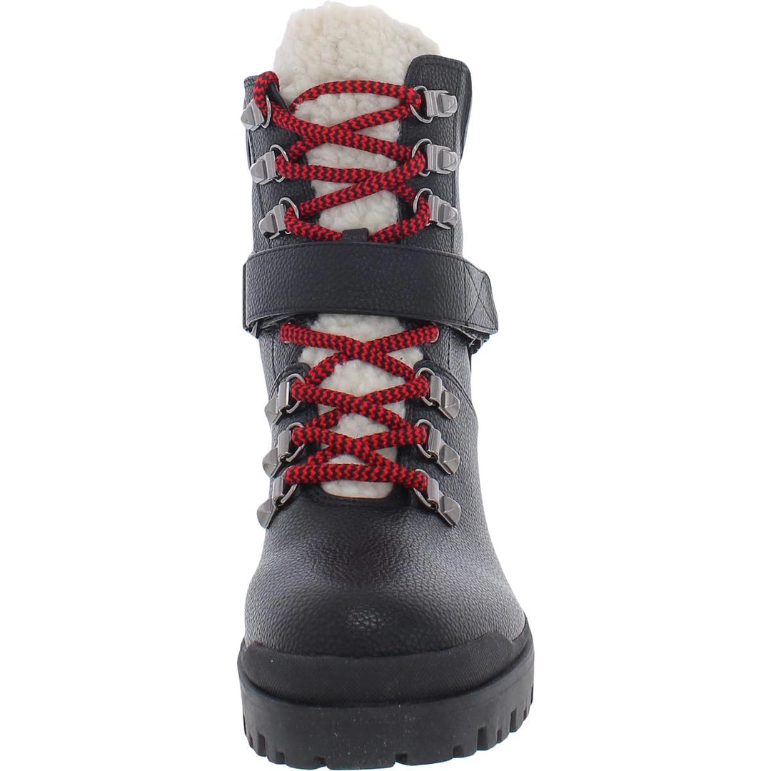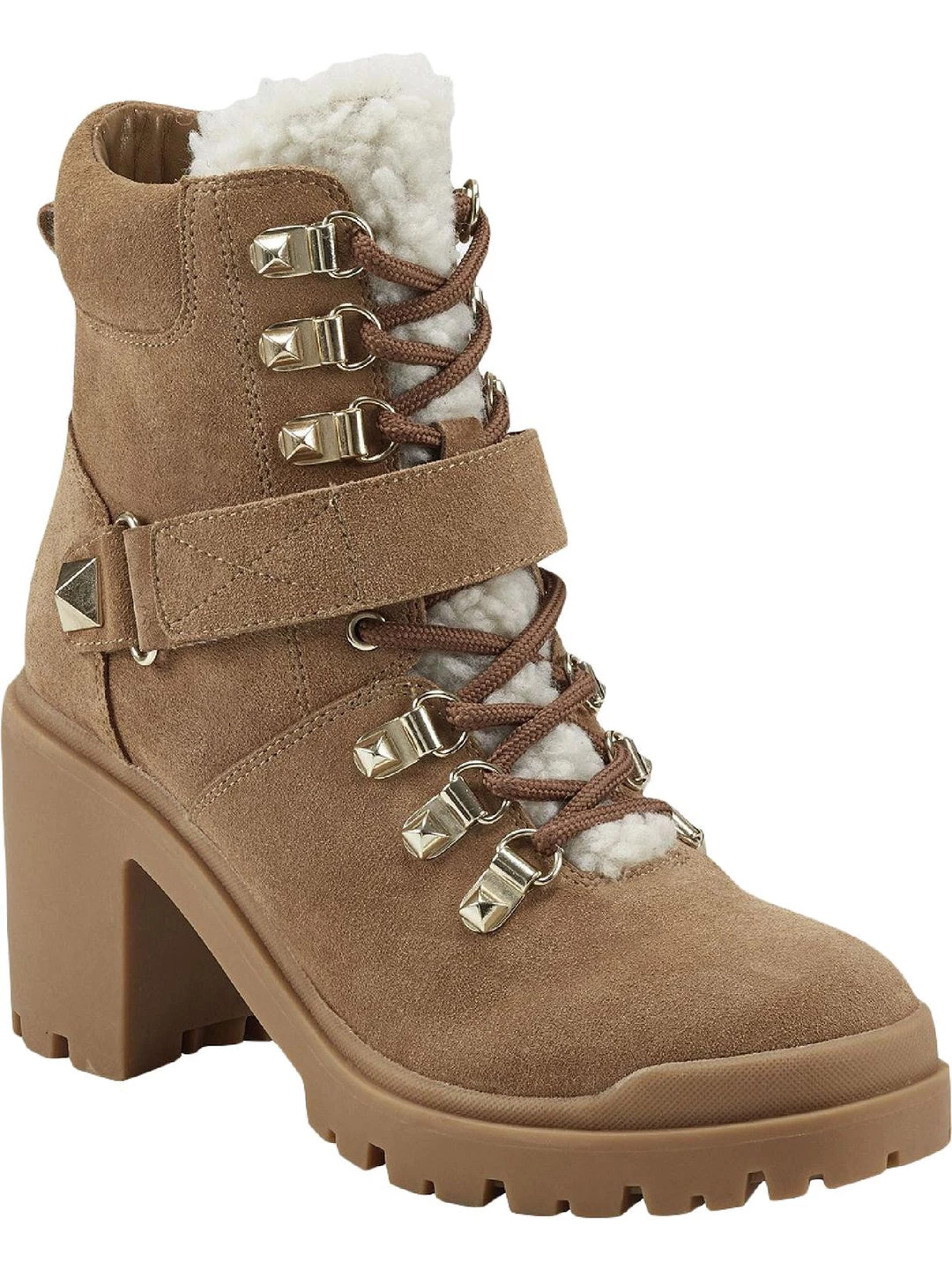 Step out in style in the Nature suede lug sole hiker booties by Marc Fisher. Suede uppers with a lace-up construction. These boots are crafted with flashy hardware, sherpa trimming, and a rounded toe. Made with a padded footbed for comfort and synthetic outsoles.